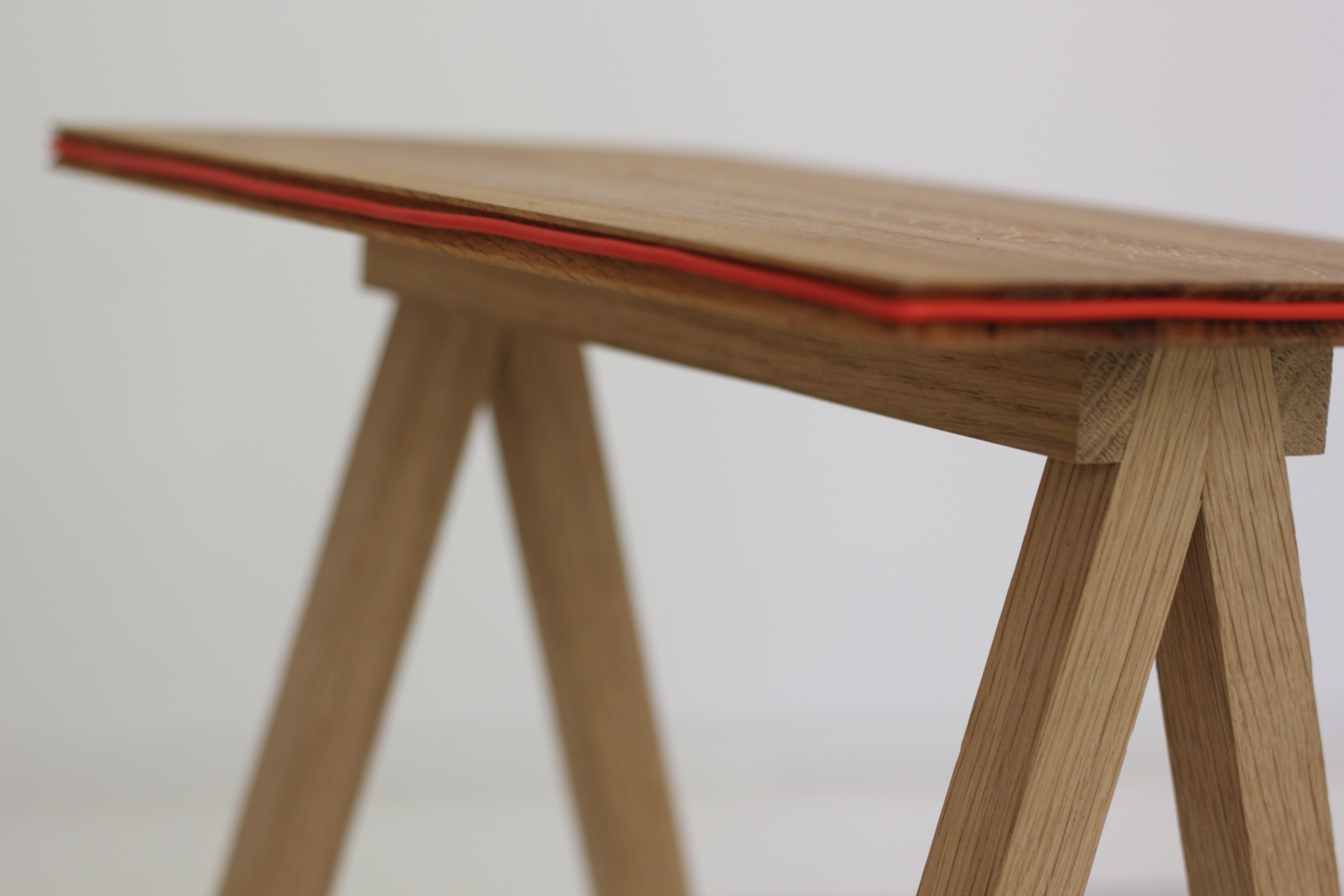De verbinding is een probeersel, evenals de rand waar de electriciteitsdraad in verwerkt is. Het tafeltje is afgewerkt met olie.
