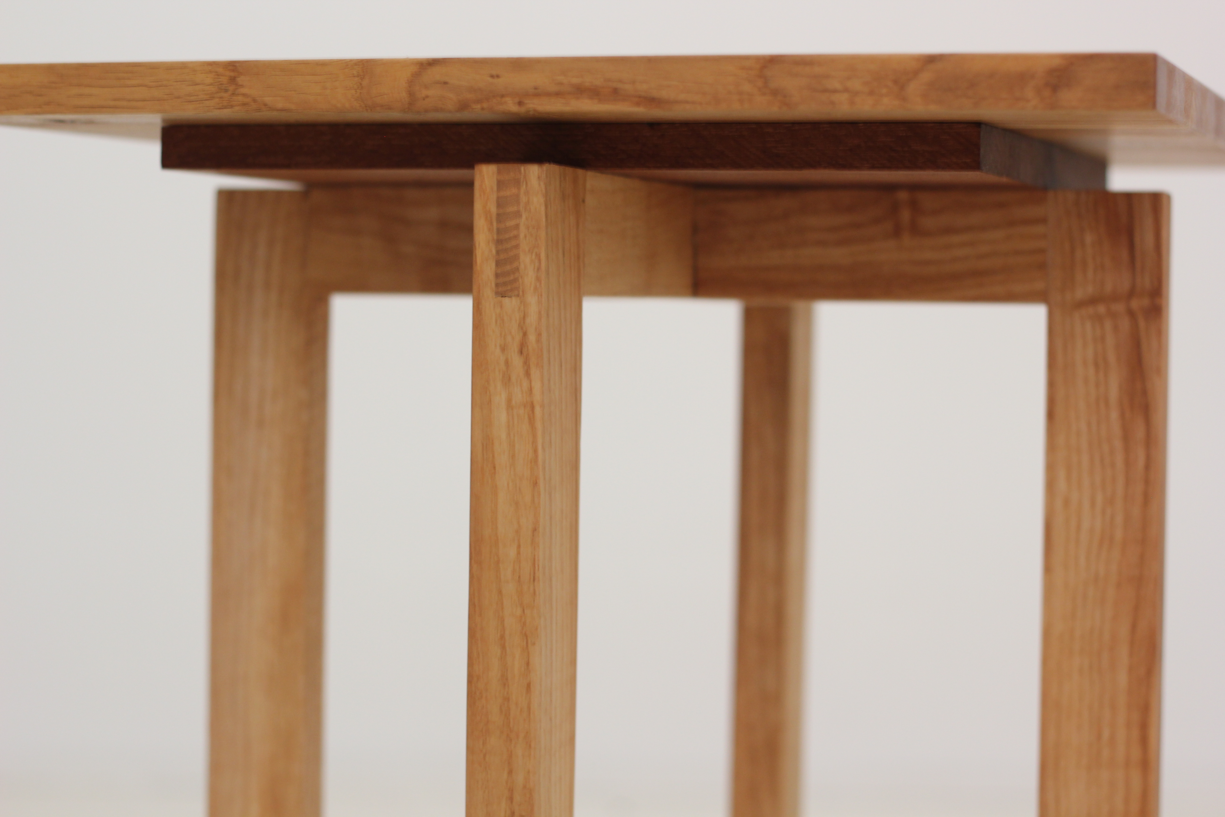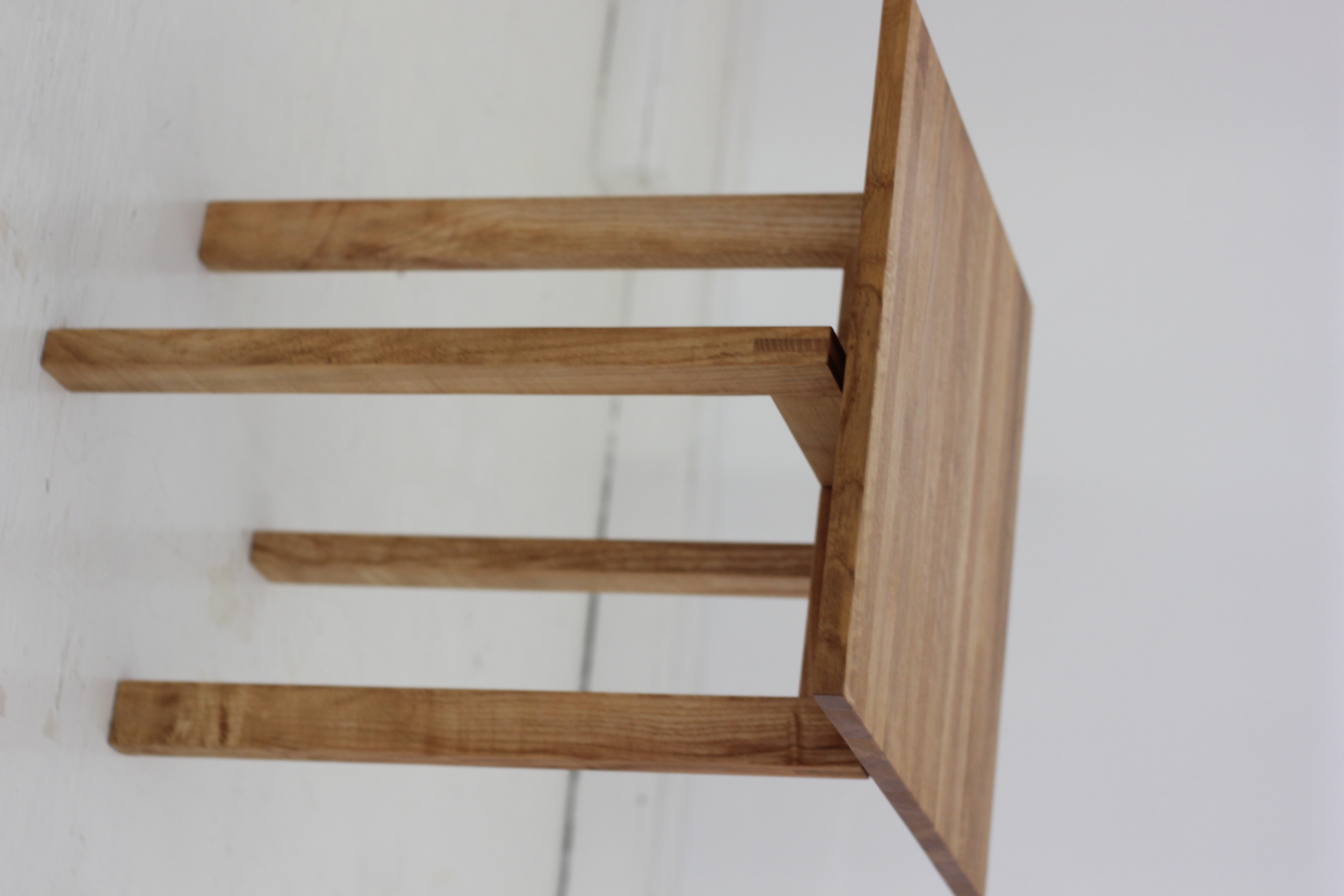 Deze bijzettafel is gemaakt van eiken resthout en een klein stukje teak afvalhout. De verbindingen zijn handgemaakt. Het bovenblad is gemaakt van dunne reepjes hout, waardoor er veel tekening van het hout te zien is.