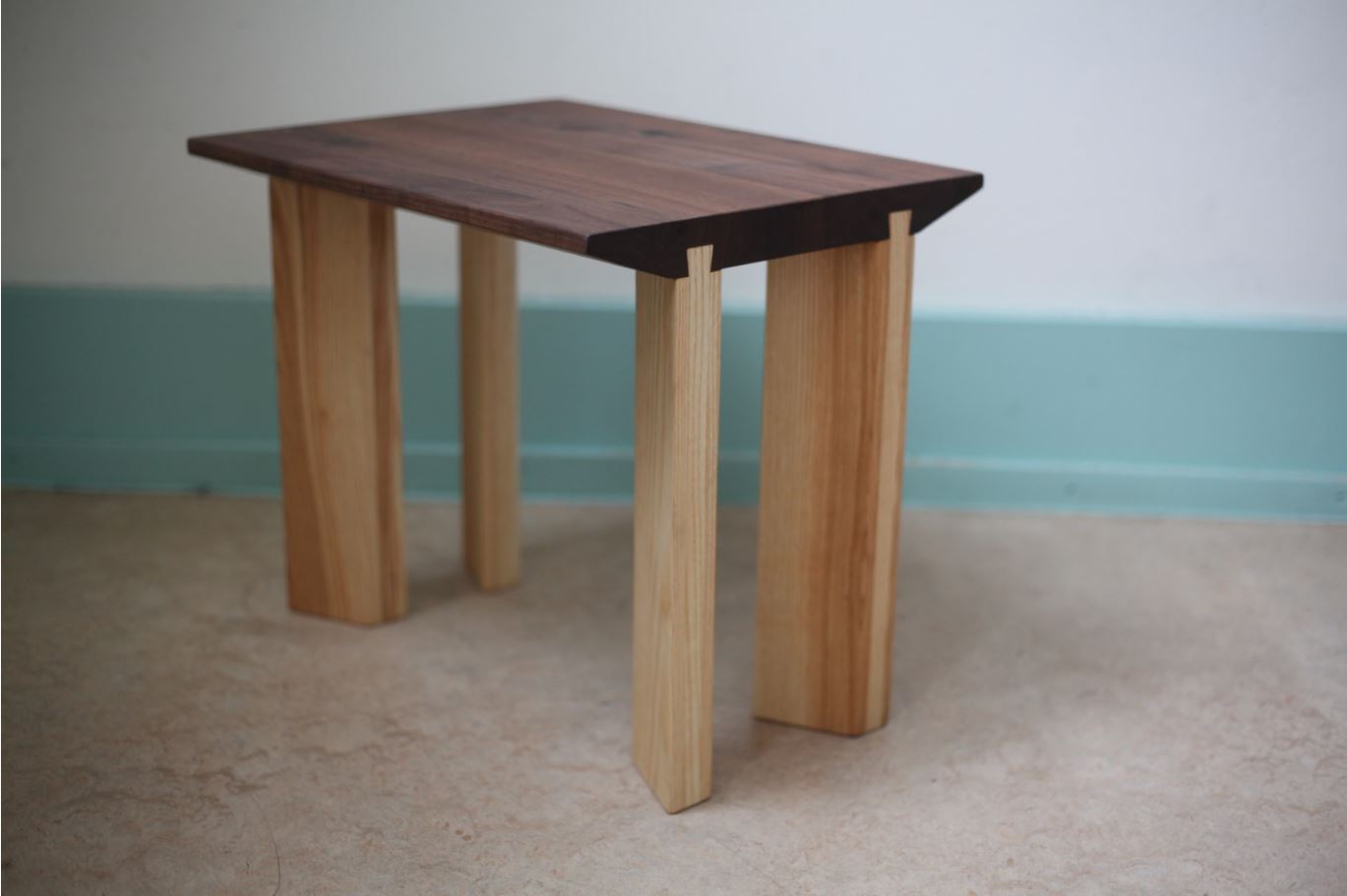 Dit tafeltje is onstaan doordat ik een aantal nieuwe gereedschappen wilde testen. Een tijd geleden vroeg een klant me om 'n gat in een notenhouten aanrecht te maken voor de wasbak; de bovenkant van dit tafeltje is het reststuk dat daar uit kwam. Voor de pootjes zijn kleine reststukjes essen gebruikt, die aan elkaar gelijmd zijn.