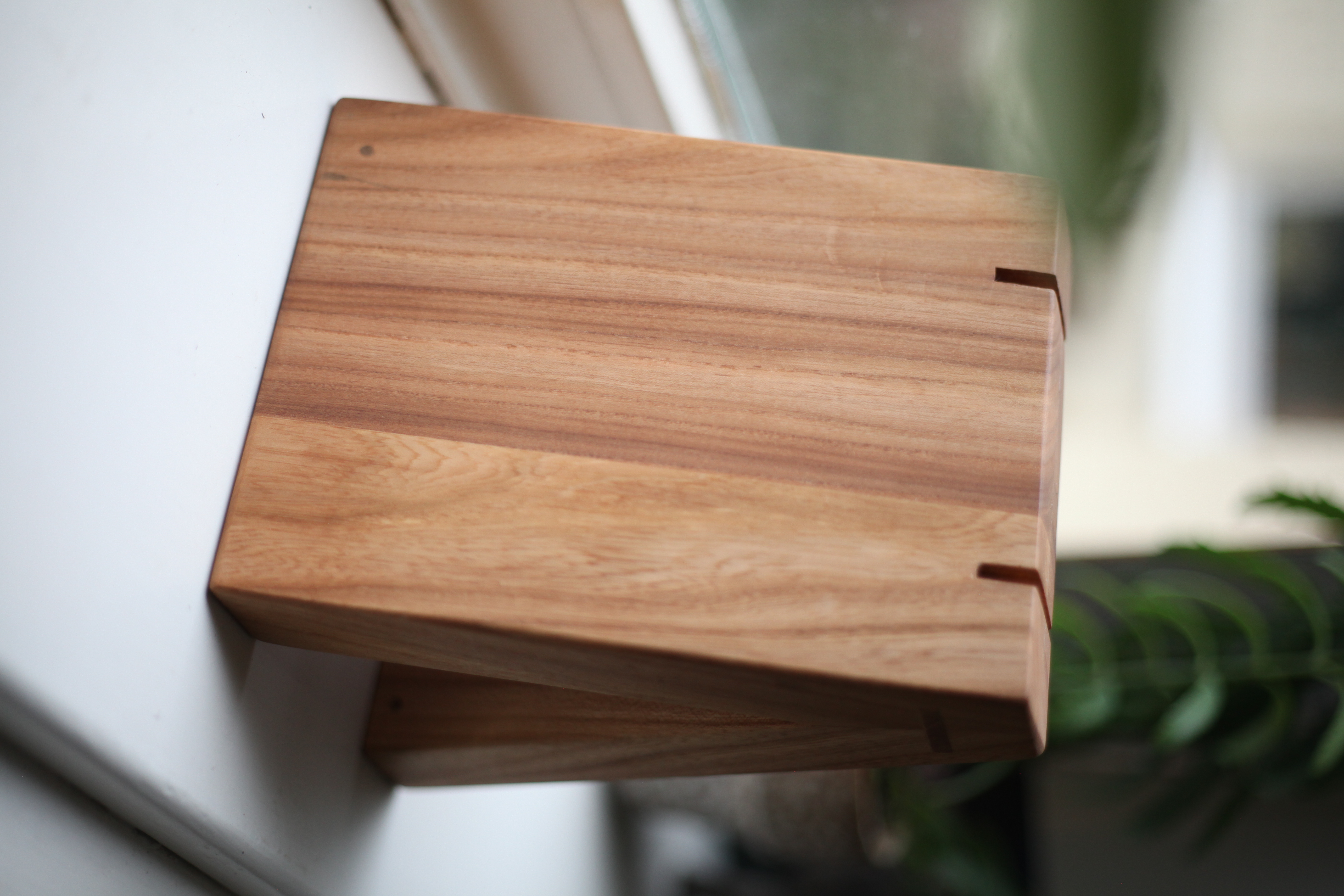 DE ZELFGEMAAKTE SCHEURKALENDERVoor De Zelfgemaakte Scheurkalender heb ik een kalenderhouder gemaakt. Aan de bovenzijde zijn gleufjes aangebracht waar de ringen van de kalender precies in passen. De houder is gemaakt van restjes iepenhout, afkomstig van Utrechts stadshout. De houtverbinding is aan de zijkant van de houder te zien.