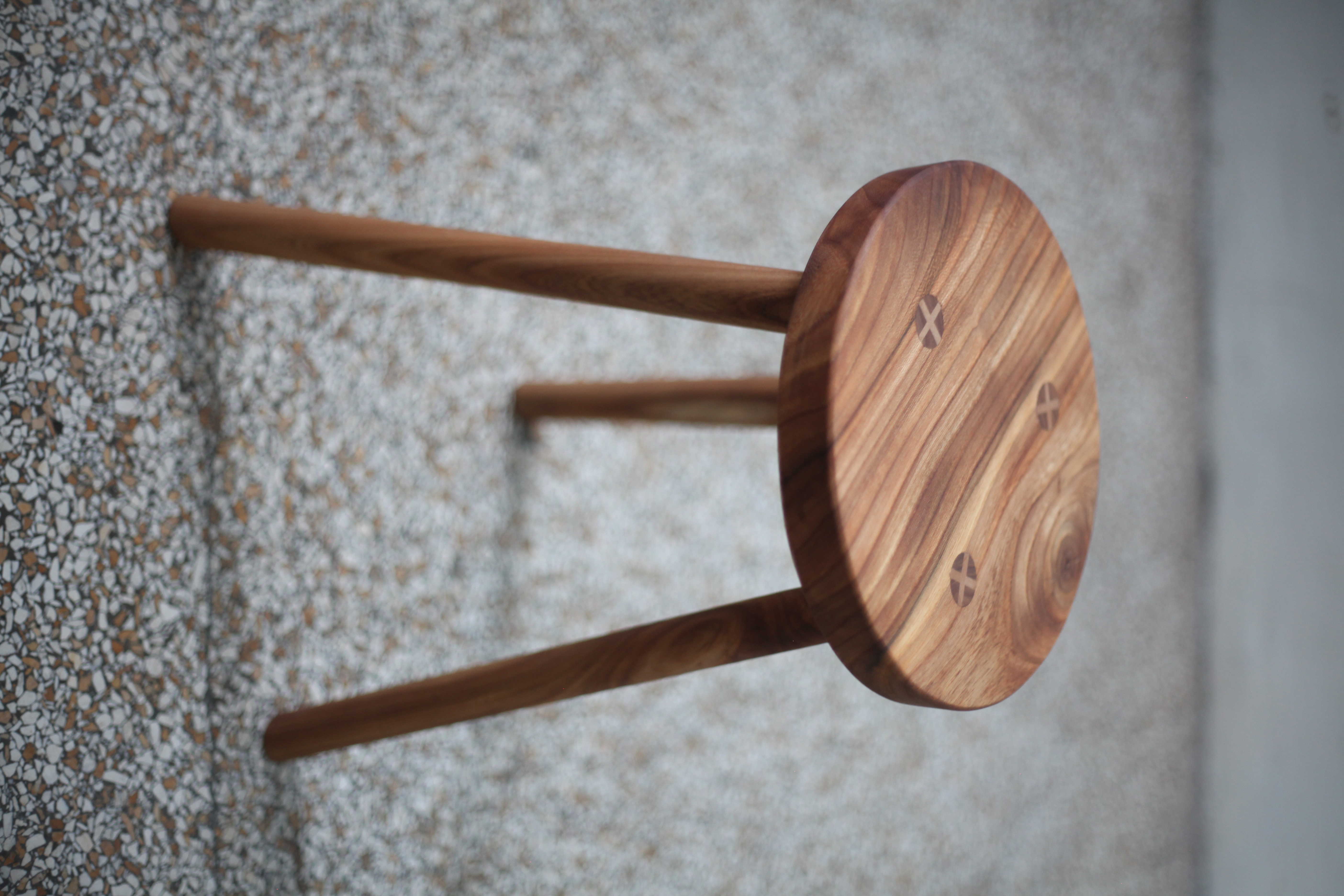 Bij het maken van een groter meubel bleven een paar kleine stukjes iepenhout over. Om een paar nieuwe technieken te proberen heb ik hiervan een kruk gemaakt, waarbij de houtverbinding in het zitvlak te zien is: een ronde pen-gat verbinding die met wiggen is vastgezet.