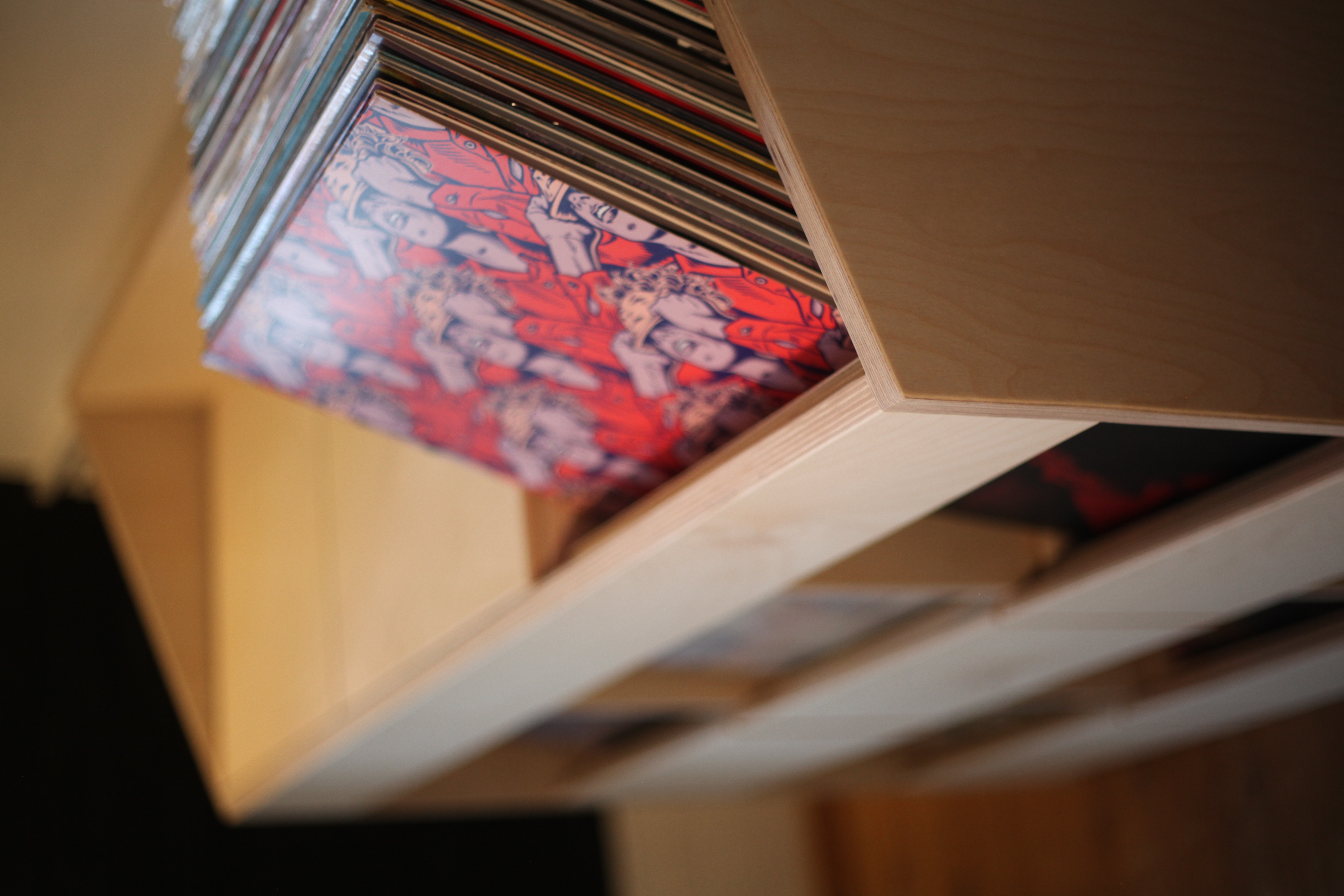 Voor het opslaan en displayen van een heleboel LP’s werd ik gevraagd een meubel te maken. Bovenin de kast zijn bakken aangebracht, zodat er gebladerd kan worden. De lades hebben een soft-close systeem, waarmee ze soepel lopen en geluidloos sluiten, ondanks het zware gewicht van de LP’s. De kast is gemaakt van berken multiplex en afgewerkt met Skylt matte blanke lak.