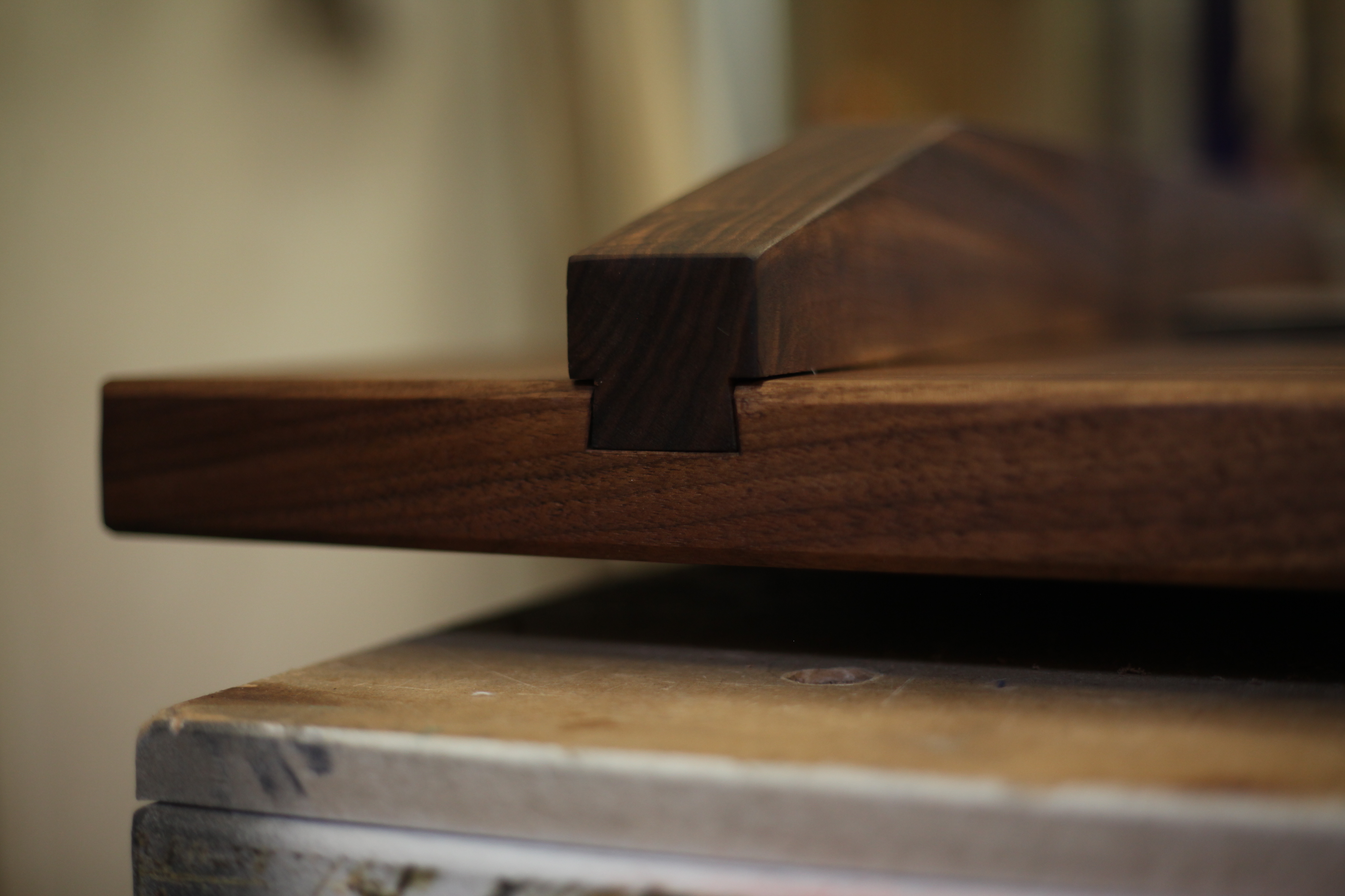 Voor een klant heb ik een tafelblad van notenhout gemaakt. Om kromtrekken te voorkomen zijn aan de onderzijde van het blad twee balken bevestigd, welke aan het blad zijn verbonden met een 'sliding dovetail'; een zwaluwstaartverbinding over de volle breedte, die je aan de zijkanten van het blad mooi ziet zitten.